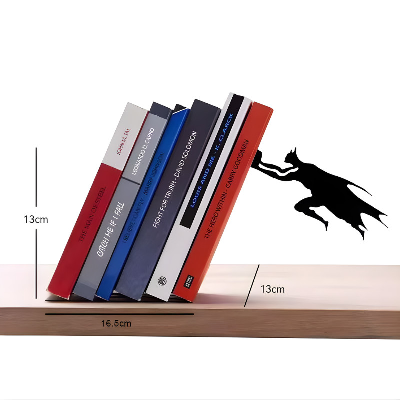 Kovová silueta superhrdiny vytváří iluzi, že neviditelnou silou podepírá celou řadu knih – ideální pro každého, kdo má rád komiksy, filmy o hrdinech nebo prostě jedinečné bytové doplňky.