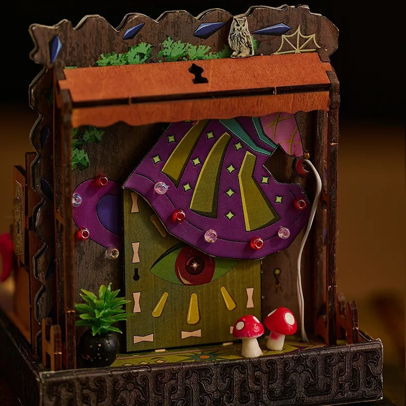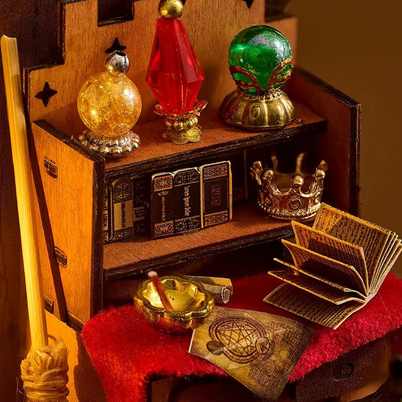 Mini diorama je malá dekorativní scéna plná detailů, která zachycuje jedinečný svět v miniatuře. Skvěle se hodí jako stylový doplněk do interiéru nebo jako originální dárek. Kouzelný koutek malé čarodějky představuje hravý a magický prostor, který ožívá díky světlu a pečlivě zpracovaným detailům.