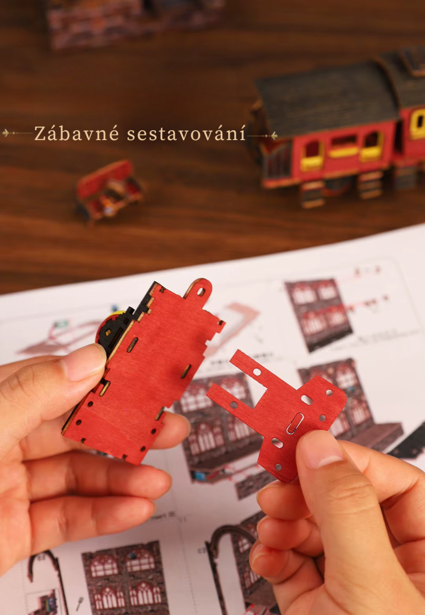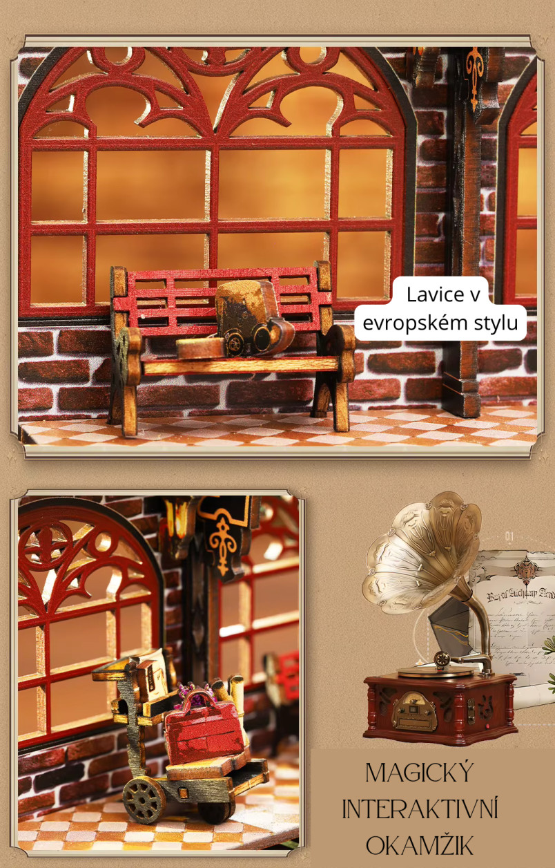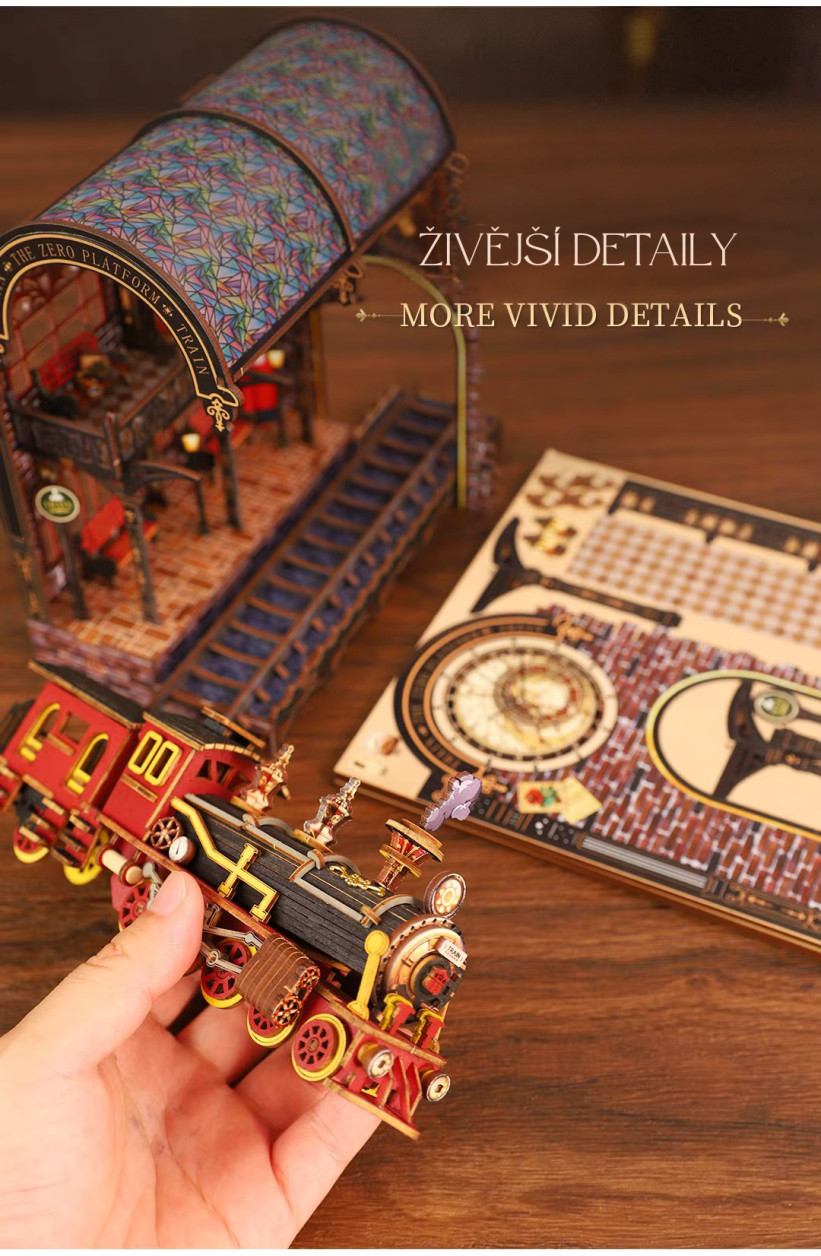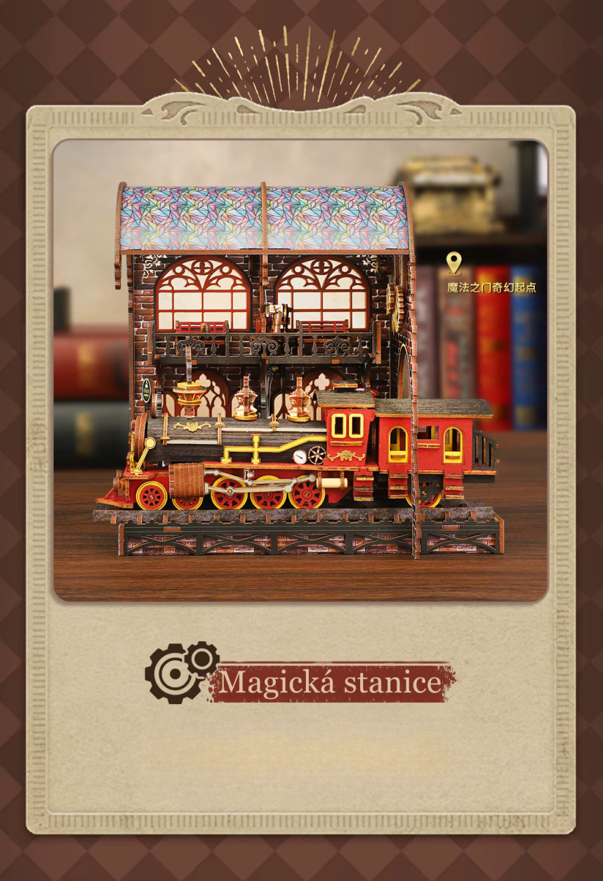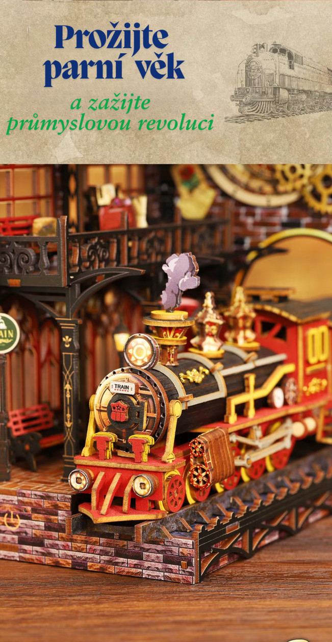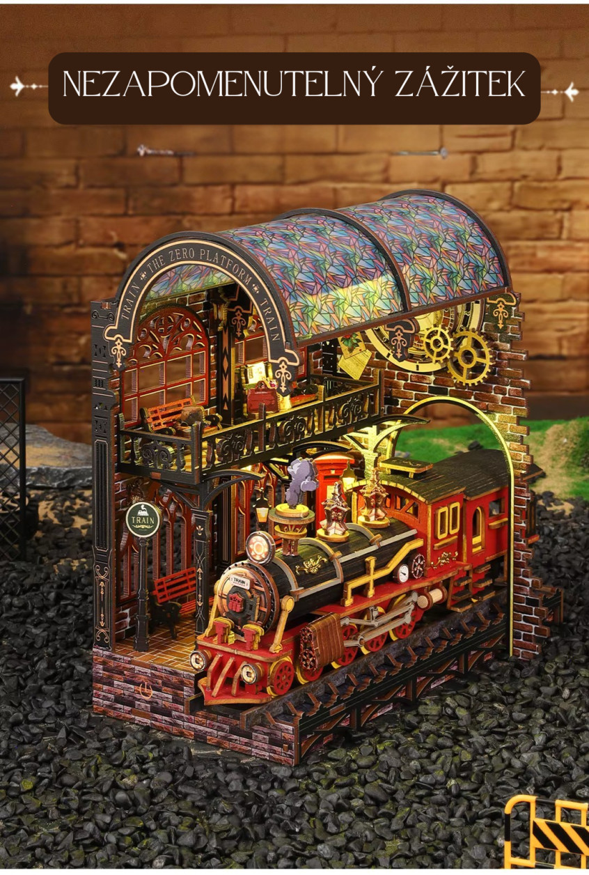 Vydejte se na cestu, která nevede po mapě, ale mezi světy. Model - Nástupiště mezi světy představuje jedinečný booknook inspirovaný steampunkovou estetikou, kde se snoubí historická železnice s prvky magie a cestování mezi dimenzemi. Dominantou scény je detailní lokomotiva přijíždějící na nástupiště, nad kterým se otevírá zářící portál. Tento prvek vytváří iluzi brány do jiného světa – místa, kde čas a prostor ztrácí své hranice. Bohaté detaily, ozubená kola a architektonické prvky dodávají modelu autentický a živý vzhled. Sestavování je nejen kreativní činností, ale i formou relaxace, která vás vtáhne do procesu tvorby. Po dokončení získáte výraznou dekoraci, která mezi knihami působí jako skrytý příběh čekající na objevení.