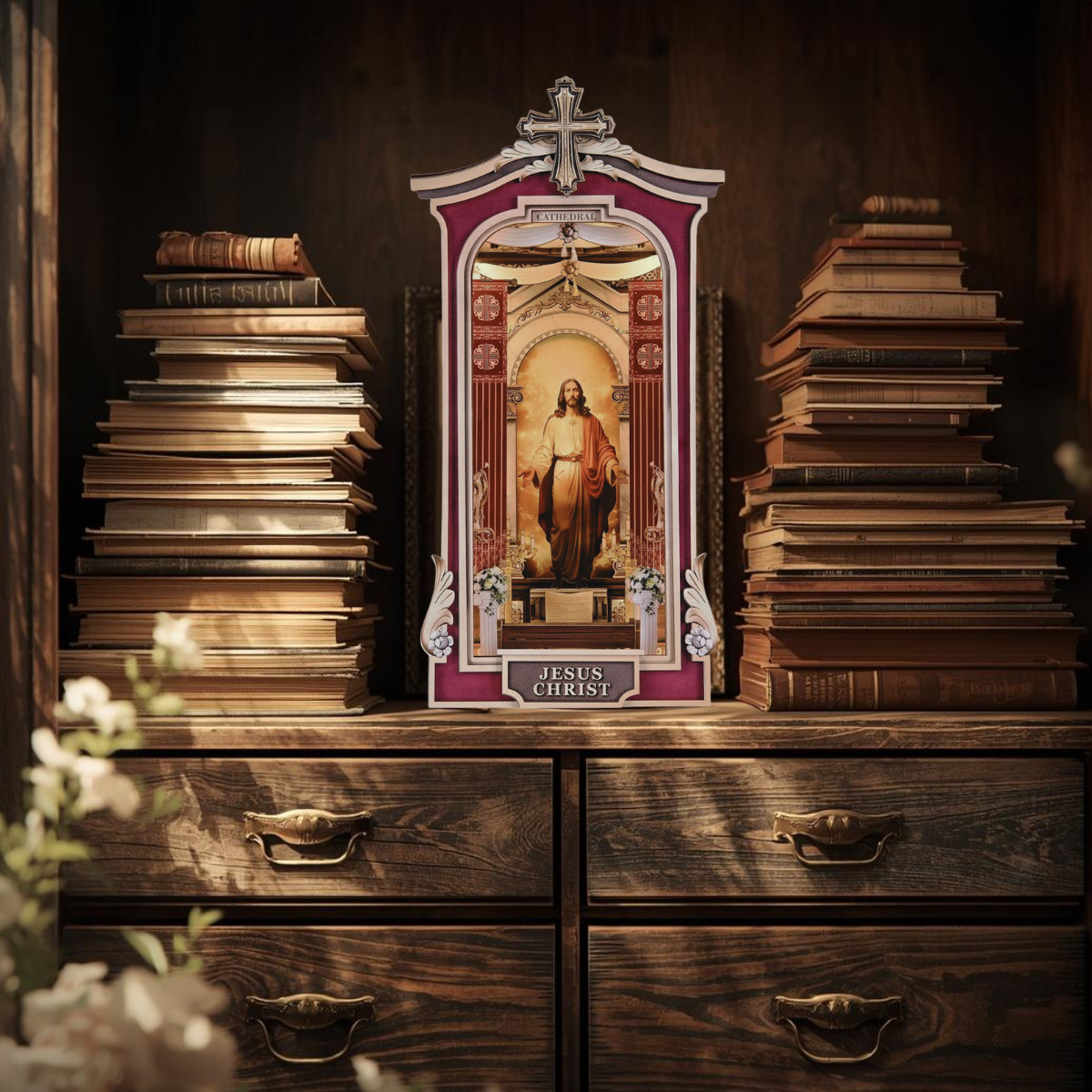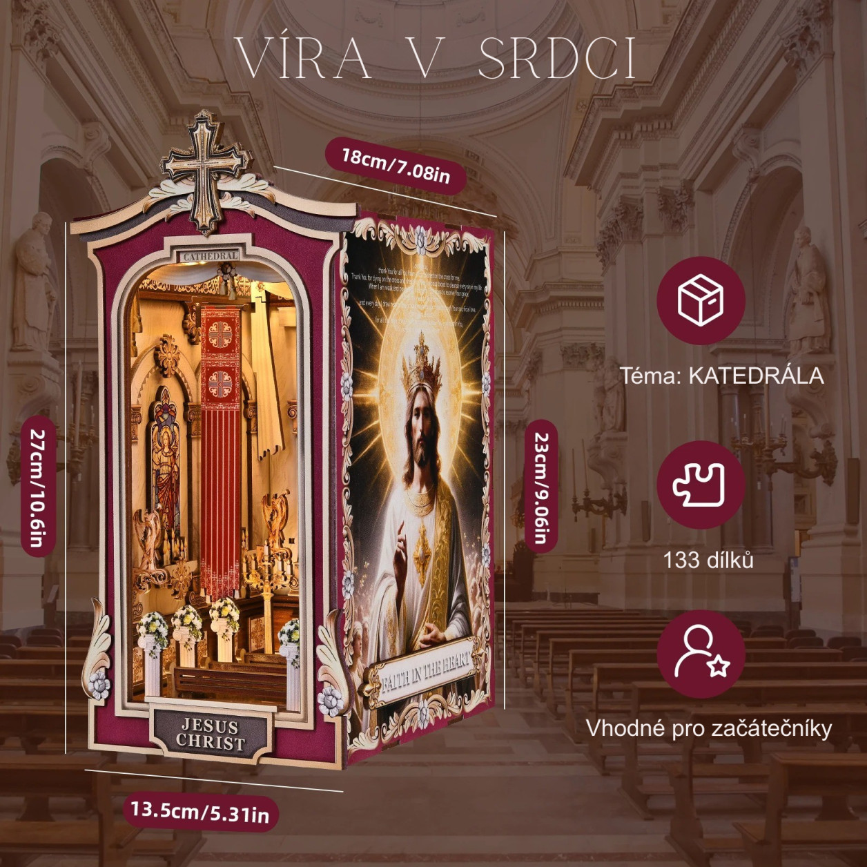Book nook je mini diorama vložené mezi knihy na polici, které vytváří iluzi malého světa ukrytého mezi knihami. Model Víra v srdci – Kostel zachycuje interiér klidného sakrálního prostoru. Dominantou je barevná vitráž, skrze kterou proniká světlo a vytváří jedinečnou atmosféru ticha a rozjímání. Detailní prvky interiéru, dřevěné konstrukce a jemné osvětlení evokují pocit skutečného kostela. Po dokončení získáte elegantní dekoraci knihovny, která přináší klid, harmonii a duchovní nádech do vašeho domova.