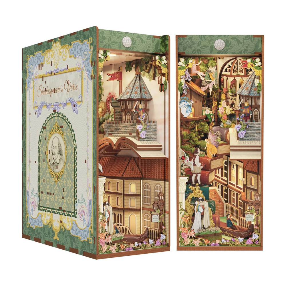 Book Nook "Svět Williama Shakespeara" vás přenese do divadelního světa světově známého autora, kde hlavní postavy ze čtyř jeho nejznámějších her - Hamlet, Romeo a Julie, Sen noci svatojánské a Kupec benátský - ožívají v úchvatných 3D detailech.