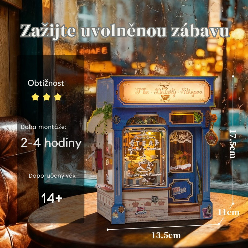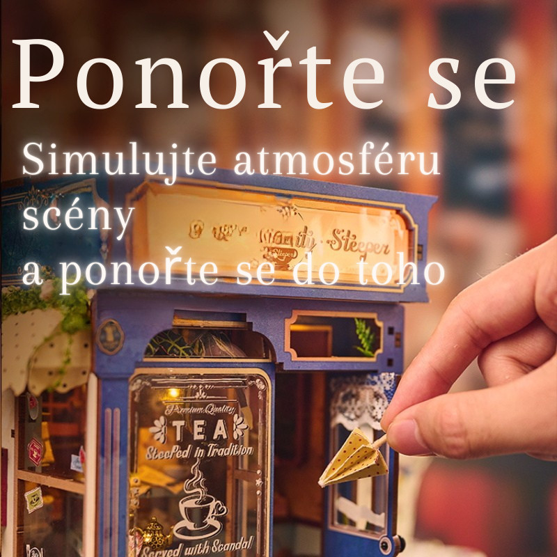 Představte si místo, kde se světlo odráží od porcelánových šálků, kamarádi se usmívají přes malými stolečky a čas plyne tak pomalu, že jej můžete pozorovat jako jemný vír listů v podzimním větru. Čajovna Jemného Lístku není jen dekorace – je to malý svět v srdci vaší knihovny, který čeká, až ho probudíte k životu. Tato drobná scéna vás zve do útulné místnosti plné dřevěných stolů, hebkých textur a příslibu teplého nápoje, který zahřeje nejen ruce, ale i duši. Vzpomínky na neviděné konverzace, nevyřčené příběhy a tichá setkání mezi stránkami knih tu ožívají s každým pohledem. Sestavení Čajovny Jemného Lístku je jako malý rituál: pomalý, soustředěný, naplněný očekáváním. Když dokončíte poslední dílek a umístíte ji mezi své knihy, otevře se před vámi okno do světa, který vás pohltí svou něhou a krásou. Čaj tu nikdy nevychladne a listy knih se šeptem dotýkají srdce každého, kdo se zastaví.