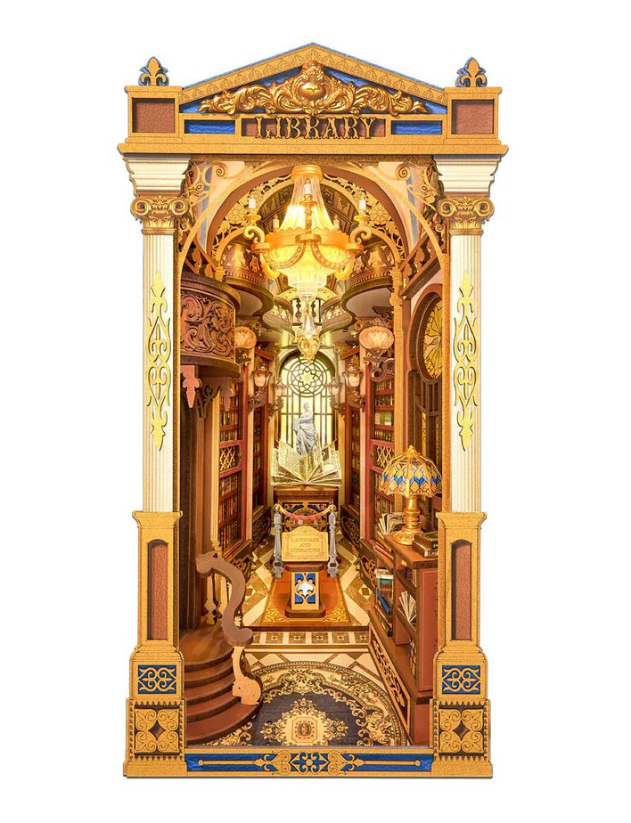 Za úzkou fasádou se otevírá majestátní interiér inspirovaný klasickou architekturou starých knihoven. Vysoké oblouky, zdobené sloupy a nekonečné řady knih vytvářejí dojem hloubky, která přesahuje skutečné rozměry modelu. Teplé LED světlo jemně prozařuje prostor, kreslí stíny mezi regály a dodává scéně hřejivou, téměř posvátnou atmosféru. Po vložení mezi knihy vznikne iluze tajné chodby do paralelního světa. Ve dne působí jako elegantní dekorace, večer se po rozsvícení mění v tichý světelný portál. Stavba samotná je zážitkem – jednotlivé precizně vyřezané díly do sebe zapadají s uspokojivou přesností a postupně před vámi vyrůstá prostor plný detailů. Model je navržen tak, aby kombinoval radost z tvoření s výsledkem, který působí jako umělecký objekt.