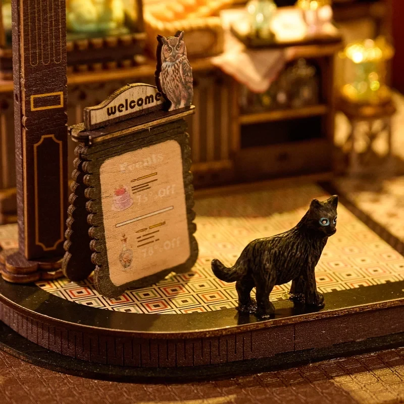 Představte si místo, kde se čas zastaví s prvním douškem kávy a oknem se line měkká záře hvězd. Kouzelná kavárna Hvězdný punč je detailní DIY Book Nook kit, který promění váš regál v teplý kout fantazie – v malou kavárnu ukrytou mezi stránkami knih. Z precizně laserem řezaných dřevěných dílů vzniká malebná scéna: dřevěné stolky, kávovar, lampy i tajemné dveře, za nimiž se možná schovává jiný svět. LED osvětlení dodá diorámě měkký jantarový lesk, takže působí, jako by se právě rozzářila ve chvíli večerního klidu.